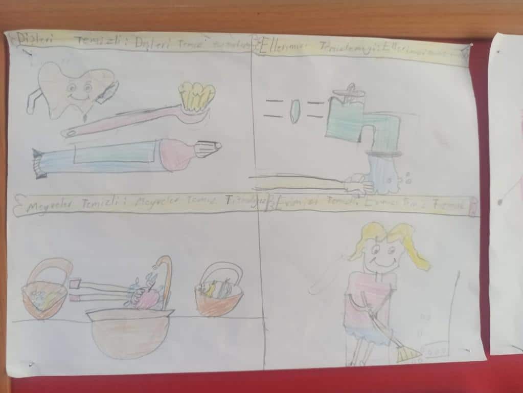 Bu amaçla okul eylem planımızda belirlediğimiz "Meyve ve Sebze Yıkama, Ayakkabı Bağlama , Geri Dönüşüm Etkinliği, Diş Fırçalama Etkinliğ, Hijyen Temalı Resim Yapma, Sınıf İçi Kuralları Belirleme, Yataklarını Düzenleme, Hayalindeki Oyuncağın Resmini Yapma, Sofra Hazırlığı, Çamaşır Katlama, El Yıkama ve Kişisel Hijyen, Geleceğin Okulu Resmini Yapma ve İletişim Engelleri ve Çözümleri' OCAK -MART- NİSAN-MAYIS ayı etkinliklerimizi tüm sınıflarımızda uygulayıp tamamladık.